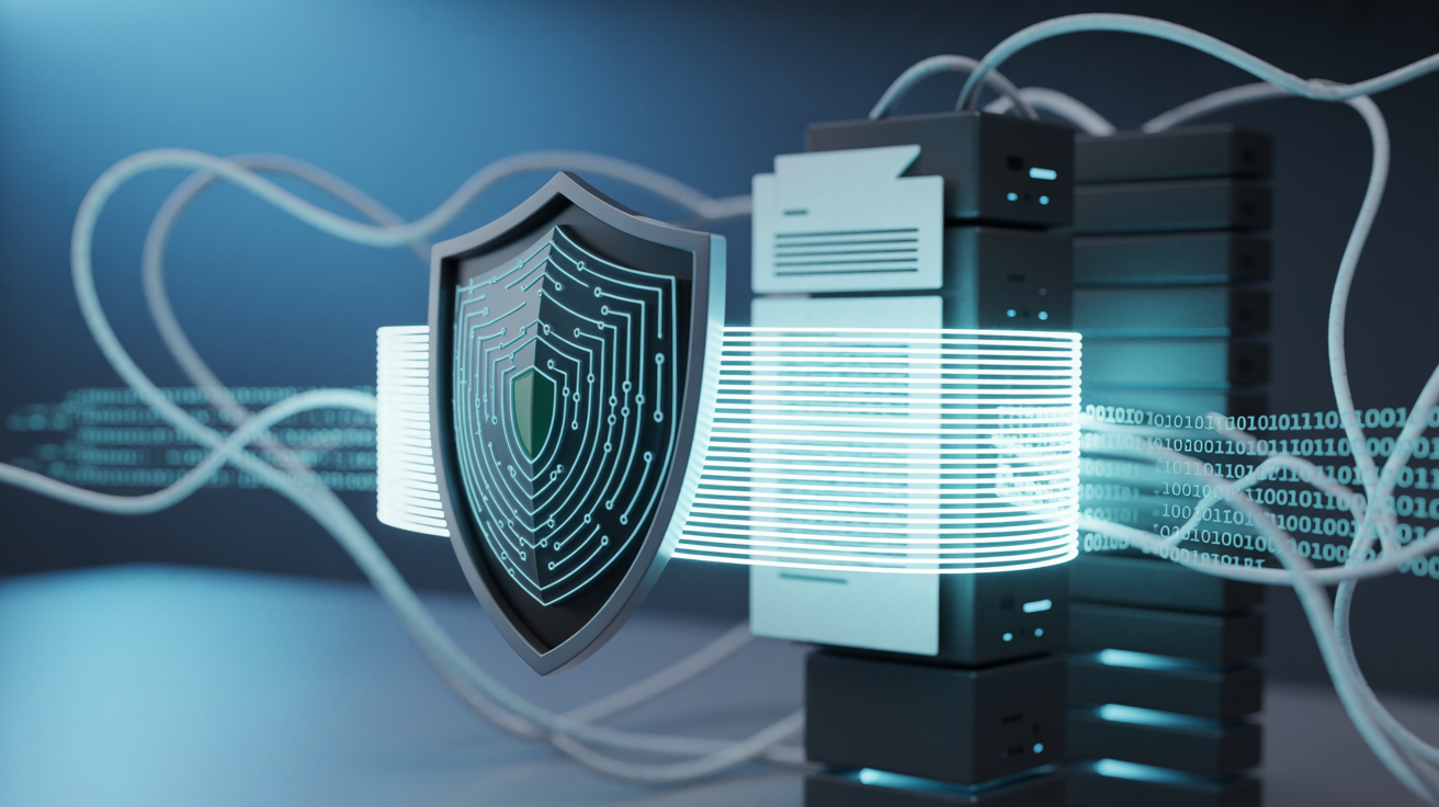 mercury racing engines , A cyber shield in front of servers, connected with wires, illustrating server security